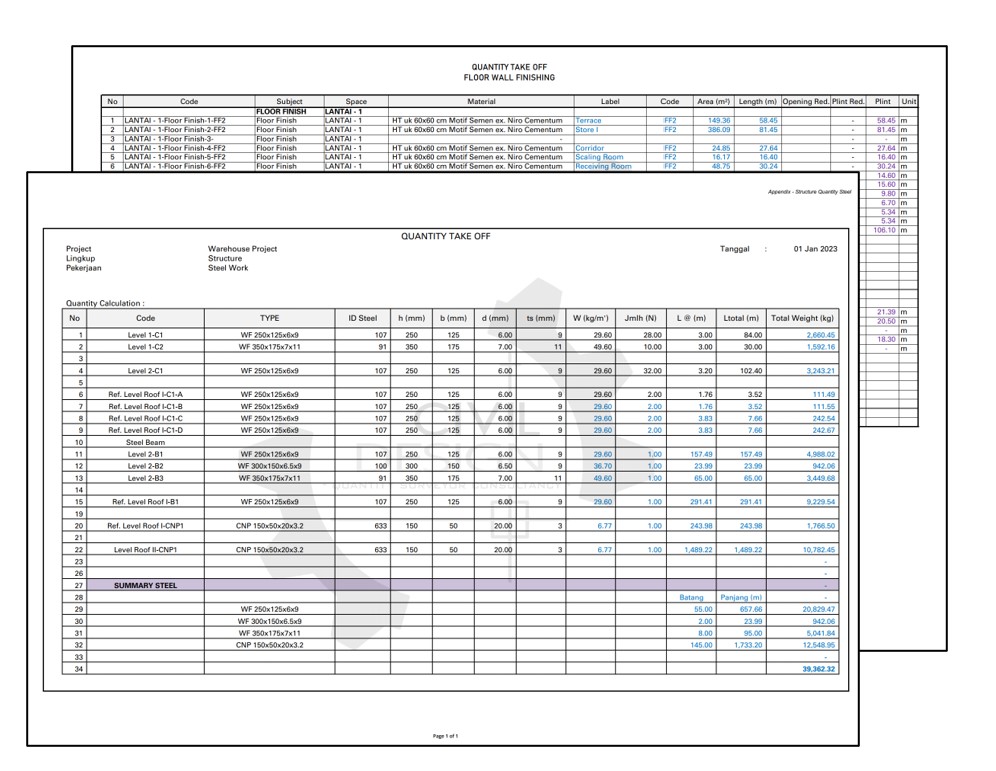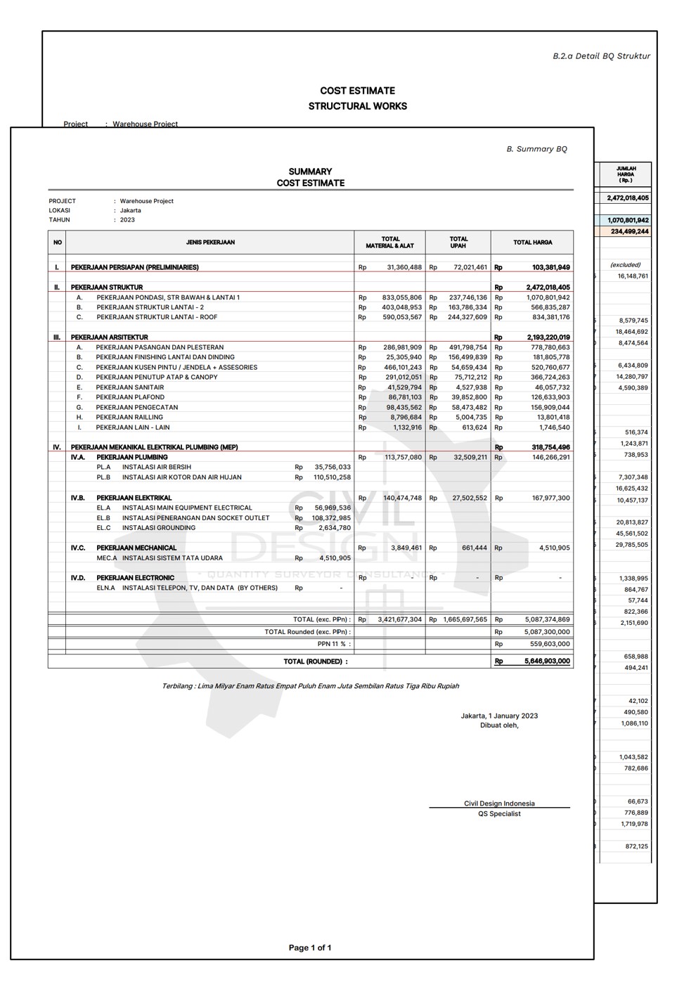 Civil Design Indonesia prioritize detailed quantity and cost calculations per work item, whether shown on the drawing or not (work items required as a work method). Work items that are lump summed are only limited to custom work, according to the client's needs